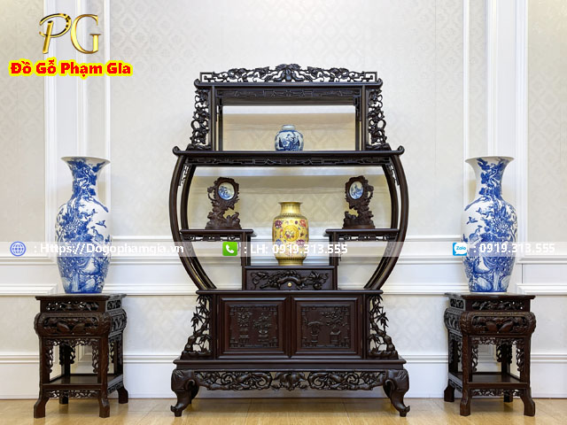 Tủ bày đồ bình phong gỗ gụ là một chiếc tủ tuyệt vời để trưng diện và trang trí trong phòng khách. Đây là món tủ bày đồ thiết kế rất linh hoạt để giúp gia chủ vừa trưng diện những món đồ cao cấp, những món đồ cổ hay những ngôi tượng gỗ một cách khoa học và có tính nghệ thuật cao.