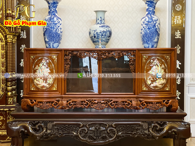 Đồ Gỗ Phạm Gia đã từ lâu được biết đến với hình ảnh những chiếc tủ chè đẹp ,hay những bộ trường kỷ gỗ ,..Tủ chè cánh cong thường được thiết kế theo hình chữ nhật nằm, với hai ngăn tủ hai bên là cánh cửa gỗ được chạm khắc, khảm trai tinh tế và ngăn giữa có diện tích lớn hơn với cửa kính